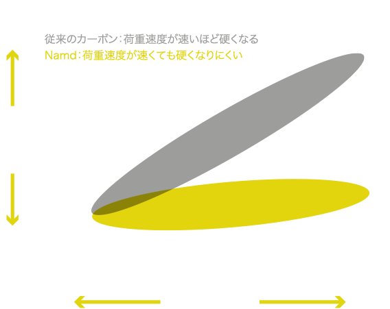 Namdは荷重速度(スウィングスピード)が速くなっても従来のカーボン素材に比べて硬くなりにくい。