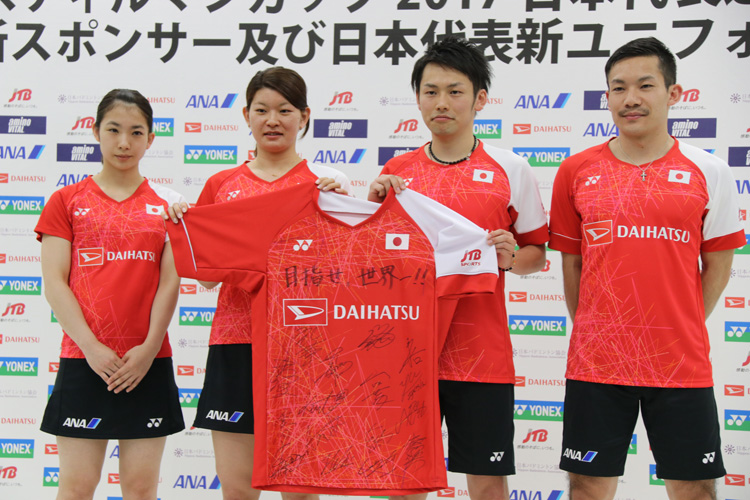 新ユニフォームを掲げ初優勝への決意を新たにした(左から)松友美佐紀、高橋礼華、嘉村健士、園田啓悟