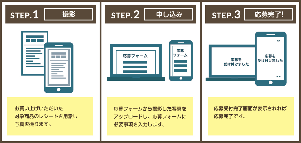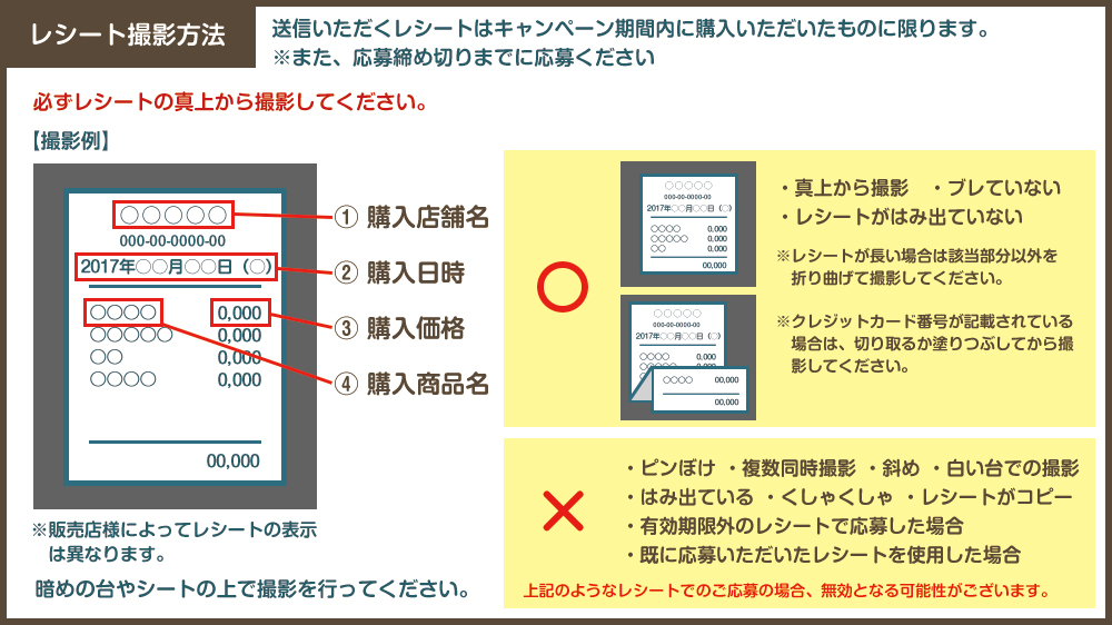 ・お一人様何口でもご応募できますが、レシート1枚のご応募につき一口とさせていただきます。ご当選は1回とさせていただきます。 ・賞品、デザインは写真と異なる場合がございます。 ・ご応募に使用する画像は個人情報が含まれないように撮影ください。 ・クレジットカードでお支払いの場合は、レシートのカード情報部分を塗りつぶしてご応募ください。 ・ご応募いただいた内容に関しての有効・無効についてのお問い合わせは受け付けておりません。 ・ご応募いただいた内容に関しての変更・取り消しはできません。 ・当キャンペーンへのご応募に関して生じたソフトウェア、ハードウェア上のトラブル・損害について、当社は一切責任を負いかねます。 ・当キャンペーンの内容は変更されることがあります。その際は随時、本キャンペーンサイト上で告知いたしますので、最新の内容をお客様にてご確認いただきますようお願いいたします。