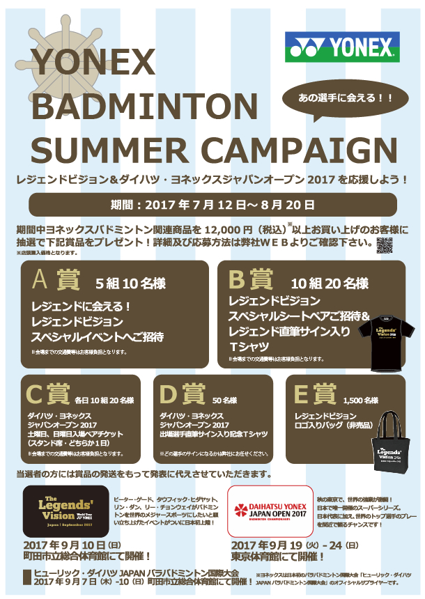 レジェンドビジョン ジャパンならびにダイハツ・ヨネックスジャパンオープン2017の開催を記念して『ヨネックスバドミントン サマーキャンペーン~レジェンドビジョン&ダイハツ・ヨネックスジャパンオープン2017を応援しよう~』を開催いたします。