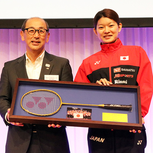 37年ぶりのユーバーカップ優勝の偉業を記念し日本代表女子チームにゴールドラケットを贈呈