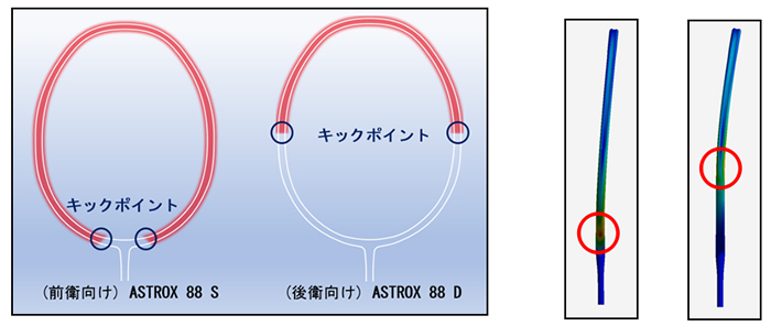 (左)ASTROX 88 Sと(右)ASTROX 88 Dでは、しなりはじめる箇所が異なることがわかります。