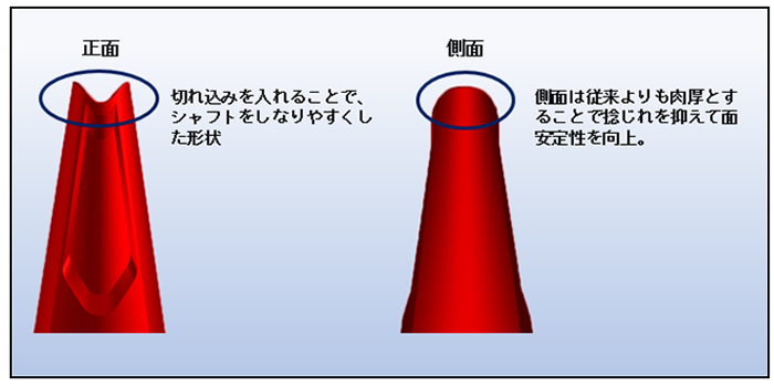 また、前・後衛向け共にシャフトのしなりを促す新形状の剣先キャップ(グリップとシャフトを繋ぐパーツ)を採用し、シャフト部分に使用しているNamd※(大きくしなって素早く戻るカーボン素材)の効果を更に引き出して、強力なショットを可能にします。
