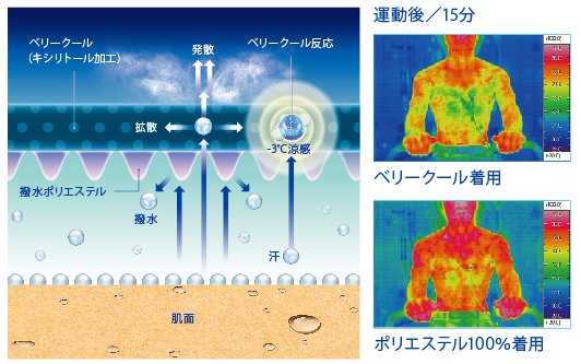 ウェア内を3℃低く保つ「ベリークール」と肌面をドライにする機能を併せ持つ新素材です。生地に配合したキシリトールが汗に反応して熱を吸収。また、汗を素早く吸収・拡散させて乾燥を促進させる生地構造を採用しています。クーリング効果と汗のベタつきのストレスを軽減させることで選手のパフォーマンスを向上させます。