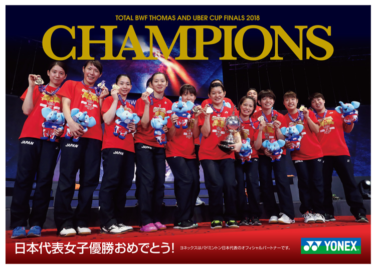 同大会で世界を圧倒した戦績を残した日本代表チームをお祝いし「TOTAL BWF THOMAS & UBER CUP FINALS 2018 日本代表女子優勝・男子準優勝おめでとうキャンペーン」を開催いたします。