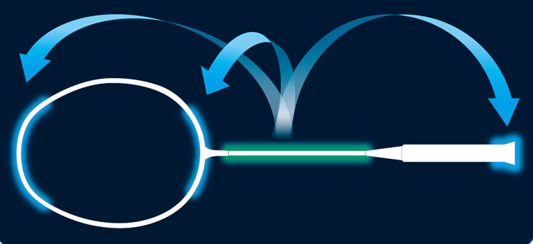 フレームの上部とジョイント部分、グリップの末端の3か所に重量を配分する設計を採用したことでフォロースルー(打撃後の振り切る動作)の勢いを落としにくくして次のショットの準備が素早くできます。また、ASTROX 55では軽量化との相乗効果でラケットの操作性が向上しています。