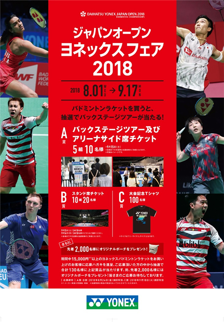 ヨネックスでは、ダイハツ・ヨネックスジャパンオープン2018(9月11日~9月16日 武蔵野の森総合スポーツプラザ)の開幕を記念して『ジャパンオープン ヨネックスフェア 2018』を開催いたします。