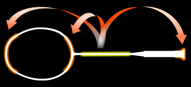 フレームの上部とジョイント部分、グリップの末端の3か所に重量を配分する設計を採用したことでフォロースルー(打撃後の振り切る動作)の勢いを落としにくくして次のショットの準備が素早くできます。ASTROX 99では全身Namd効果によるスマッシュスピードの向上と相まって、高速スマッシュが連打できるラケットが実現しました。