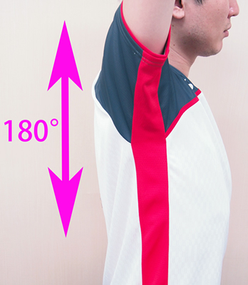 腕の可動域を180°に設定することで、肩周りの突っ張り感を軽減。腕が上がりやすく、スマッシュ等の大きなスウィングがより打ちやすくなりました。