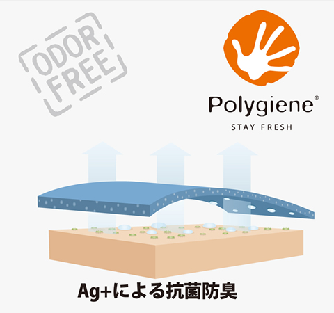 再生銀から生成される銀塩(塩化銀)をベースとする素材「ポリジン」がニオイの原因となるバクテリアの増殖を抑制。衣類を常に爽やかで快適に保ち、長持ちさせます。