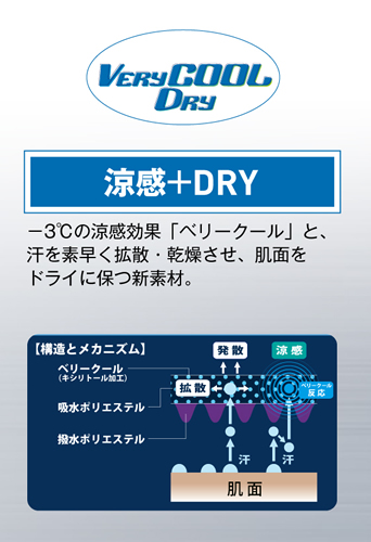 ウェア内を3℃低く保つ「ベリークール」と肌面をドライにする機能を併せ持つ素材「ベリークールドライ」。生地に配合したキシリトールが汗に反応して熱を吸収。さらに汗を素早く吸収・拡散し、乾燥を促進させる生地構造を採用しています。クーリング効果、汗のベタつきのストレス軽減により、選手のパフォーマンスを向上させます。