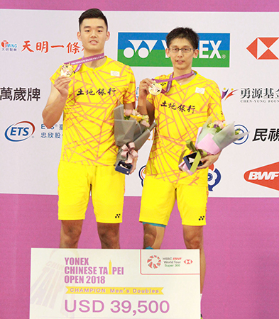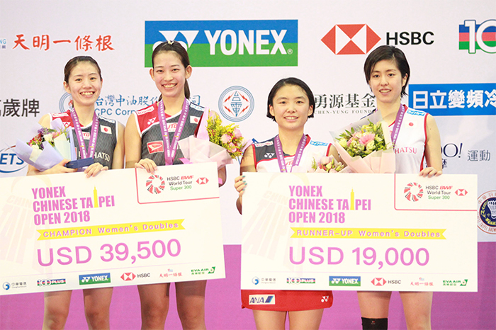 女子ダブルスでは、志田千陽&松山奈未ペア(再春館製薬所)と栗原文音&篠谷菜留(日本ユニシス)との日本勢同士の対決となり、21-10、21-17のストレートで志田&松山ペアが勝利し、嬉しいワールドツアー初優勝を飾りました。男子ダブルスでは地元チャイニーズタイペイ同士の対決が実現し、世界選手権銅メダルのチェン・フンリン&ワン・チーリンがストレートで勝利し、満員の会場は大いに盛り上がりました。