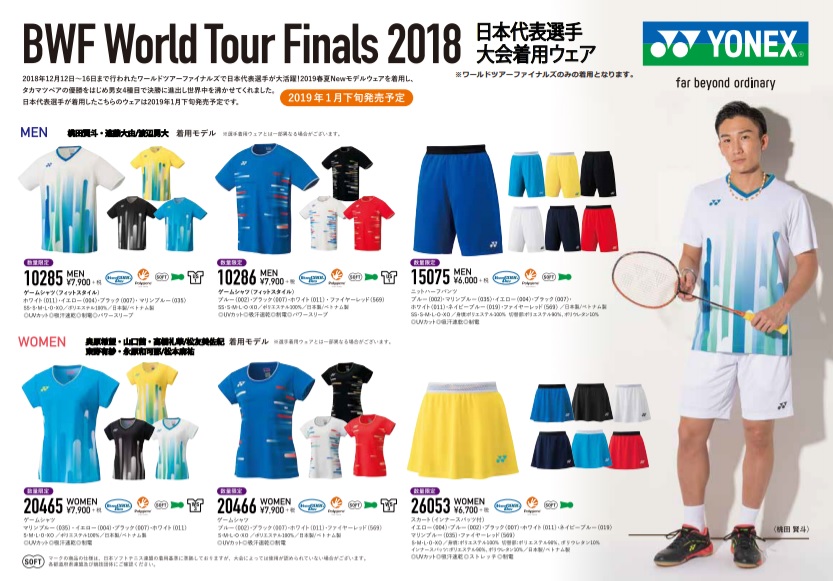 2018年の各種目上位8選手(組)が年間王者を争うワールドツアーファイナルズで、日本代表選手が着用していたイエローやブルーなど多彩なウェアをご覧になり、おっ!と思われた方も多いのではないでしょうか。