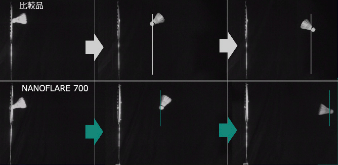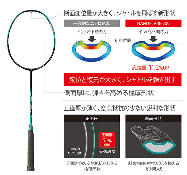 NANOFLARE 700はフレーム形状を従来品から一新しました。シャトルを弾く力を高めつつ空気抵抗の軽減と手に掛かる衝撃を和らげる高次元のエアロ形状を新開発。振り抜き、操作性、弾きのすべてを高める形状を実現し、軽快な打感でシャトルを速く飛ばせます。