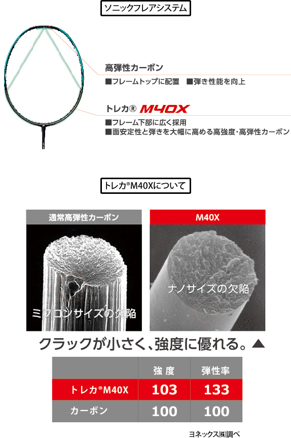 さらに、シャトルの弾きを大きく高める構造として、フレーム上部に弾性率の高いカーボンを配置し、下部には強度と高弾性を併せ持つ新カーボン素材「トレカ®M40X※」を用いた「ソニックフレアシステム」を新採用。これまでヘッドライトラケットの最軽量だった4U[平均83g]の壁を突破し、初めて5U[平均78g]の軽さを実現しました。