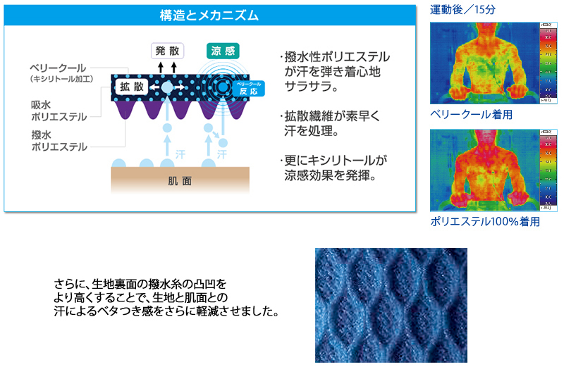 ウェア内を3℃低く保つ「ベリークール」と肌面をドライにする機能を併せ持つ新素材です。生地に配合したキシリトールが汗に反応して熱を吸収。また、汗を素早く吸収・拡散させて乾燥を促進させる生地構造を採用しています。クーリング効果と汗のベタつきのストレスを軽減させることで選手のパフォーマンスを向上させます。