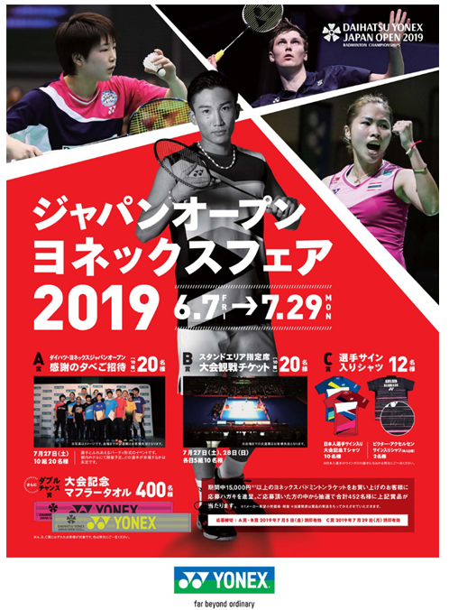 ヨネックスでは、ダイハツ・ヨネックスジャパンオープン2019(7月23日~7月29日 武蔵野の森総合スポーツプラザ)の開幕を記念して『ジャパンオープン ヨネックスフェア 2019』を開催いたします。