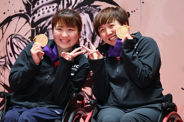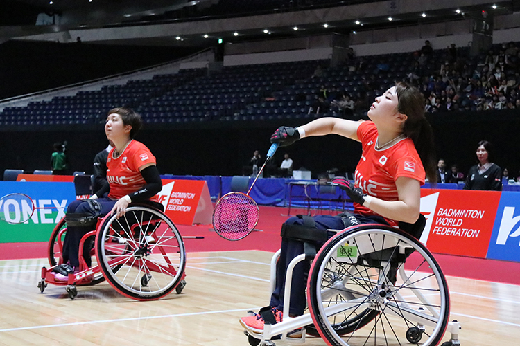 女子ダブルス(車いすWH1、WH2クラス)では、今年の世界選手権で初優勝を飾った注目の里見紗李奈選手(NTT都市開発)が山崎悠麻選手(同)とペアを組み出場。中国ペアに押される苦しい展開の中、セカンドゲーム中盤から自分達のペースを取り戻し、13連続ポイントを上げるなどで、14-21、25-23、21-15と大逆転勝利で嬉しい大会連覇を果たしました。