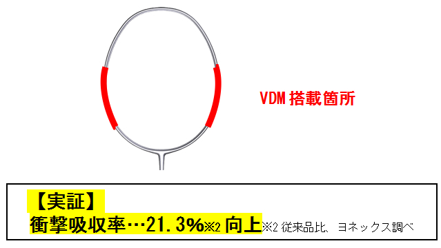 通常のカーボンの約2.4倍※1の振動吸収性を持つ新振動吸収素材「VDM(Vibration Dampening Mesh)」をフレームサイドの広範囲に使用し大幅に振動吸収性を向上。弾き性能はそのままに腕や肘への打球時の衝撃を緩和します。 ※1 通常カーボン比、ヨネックス調べ