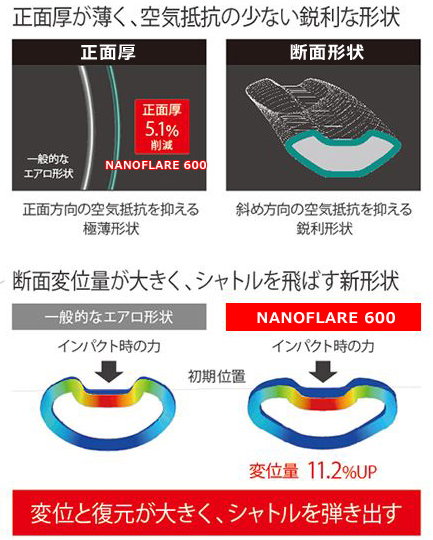 腕や肘の怪我を心配する多くのプレーヤーに向けて、弊社ではバドミントンを長く楽しく続けていけるようにNANOFLARE 600を"身体にやさしいラケット"としてご提案いたします。通常のカーボンの約2.4倍の振動吸収性を持つ新振動吸収素材「VDM(Vibration Dampening Mesh)」をフレームサイドの広範囲に使用し、振動吸収率を約21%向上させました。また、NANOFLAREシリーズ共通イノベーションであるスウィング時の空気抵抗を大幅削減するフレーム形状と高い弾きを生む「ソニックフレアシステム」を採用。さらに、シリーズの中で最もヘッドライトな設計となっており、軽く振りやすく柔らかな打感で楽にシャトルを飛ばすことができます。