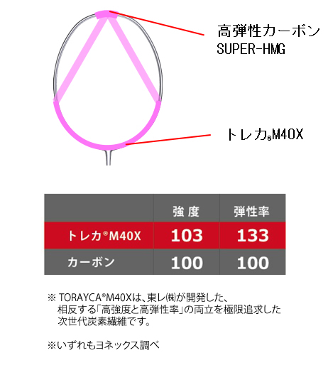 フレームトップに高弾性カーボン「SUPER-HMG」を採用。フレーム下部には強度と高弾性を併せ持つ新カーボン素材「トレカ®M40X※」を広範囲にわたって配置することで、面安定性と弾きを大きく高めます。