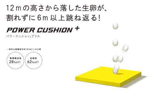「パワークッション®プラス」は、従来の軽量性を保ちつつ、衝撃吸収性を28%※1、反発性を62%※2向上させ(一般的な衝撃吸収材[EVA]