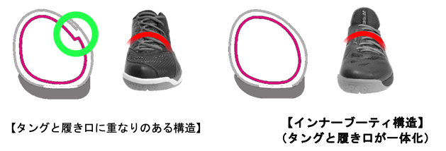 タングと履き口を一体化させ、重なりをなくした「インナーブーティ構造」が足とシューズの間の隙間をなくし、フィット性を高めます。