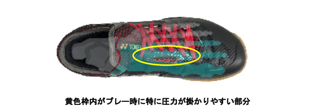 本製品では、かかと部分と前足部に「パワークッション®プラス」を配置。かかと部は、かかとの外側から着地するバドミントン特有の フットワークに対応した新形状を採用し、更に衝撃を吸収しやすくしています。
