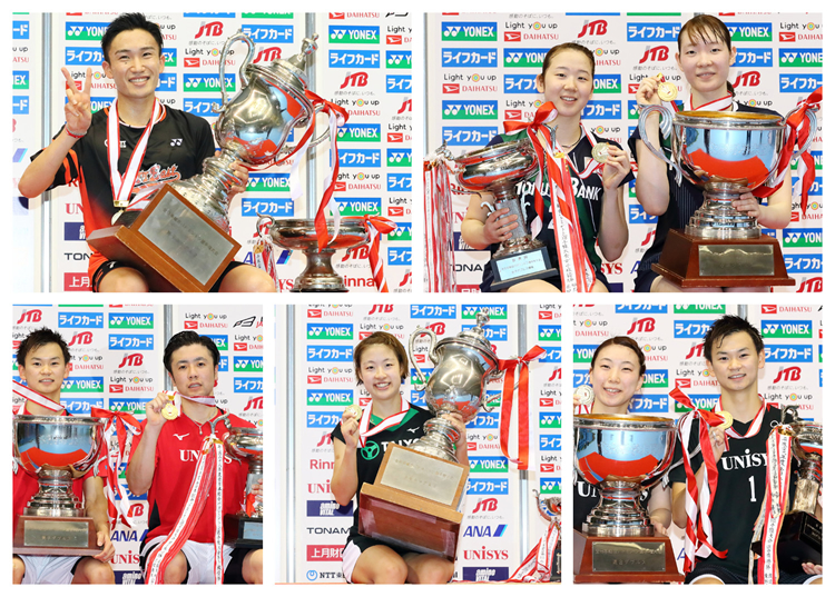 女子シングルスの奥原希望選手(太陽ホールディングス)は初優勝を狙う大堀彩選手(トナミ運輸)を22-20、21-4で下し、4年ぶり3度目の優勝。男子ダブルスの遠藤大由&渡辺勇大ペア(日本ユニシス)は園田啓悟&嘉村健士ペア(トナミ運輸)に11-21、21-18、21-8で逆転勝利し、2年ぶり2度目の優勝。混合ダブルスの渡辺勇大&東野有紗ペア(日本ユニシス)は西川裕次郎&尾﨑沙織ペア(NTT東日本)と対戦し、21-13、21-15のストレート勝ちで3連覇を成し遂げ、渡辺選手は男子ダブルス、混合ダブルスでの2冠を達成しています。