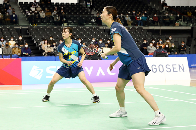 女子ダブルスの保原彩夏&宮浦玲奈ペア(ヨネックス)は、櫻本絢子(ヨネックス)&鈴木陽向(NTT東日本)ペアと対戦。保原&宮浦ペアは第1ゲームを21-17で先取したものの、続く第2ゲームではリードを奪われる展開に。その後11-12から9連続得点で逆転し、最後は追い上げを振り切り勝利。