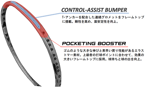 フレームトップには、「T-アンカー」を配合した連続グロメット「CONTROL-ASSIST BUMPER(コントロールアシストバンパー)」を搭載し面安定性がアップ。さらに、ゴムのような大きな伸びと素早い戻り性能があるエラストマー素材を用いた「POCKETING BOOSTER(ポケッティングブースター)」を上級者の打球ポイントに合わせて、効果の大きいフレームトップに搭載し、球持ちと球の出が向上しました。