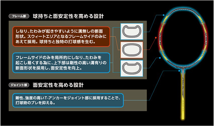 中上級者のスウィングに合わせた新設計で飛び性能とコントロール性が向上し、狙い定めたコースへの攻撃的なショットを可能にするバドミントンラケットです。