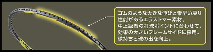 シャフトは、中上級者に最適なしなり、トルクを生むこだわり抜いた設計により、コントロール性と飛び性能を高めました。さらに、ゴムのような大きな伸びと素早い戻り性能があるエラストマー素材を用いた「POCKETING BOOSTER(ポケッティングブースター)」を中上級者の打球ポイントに合わせて、効果の大きいフレームサイドに搭載し、球持ちと球の出を向上させます。