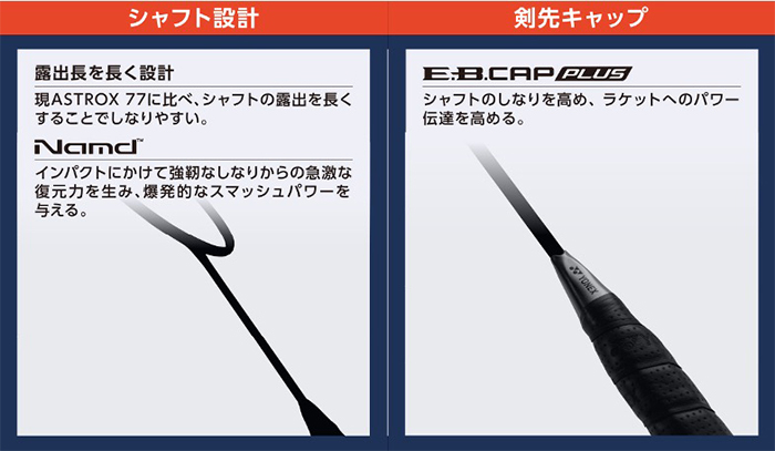 本製品は、オールラウンドな性能と伸びのあるショットが特徴で、男子ダブルスのファジャル・アルフィアン(インドネシア)の他、女子シングルスの世界ランキング上位選手であるチェン・ユーフェイ(中国)やアン・セヨン(韓国)らが使用し好成績を上げている「ASTROX 77」をさらに進化させました。