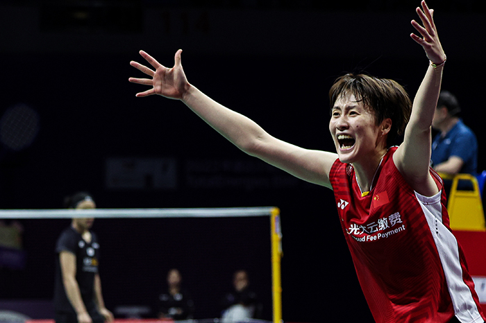 優勝を決めたのは、女子シングルス、チェン・ユーフェイ。混合ダブルスのジェン・スーウェイ/ファン・ヤーチョン、男子シングルスのシー・ユーチの白星のあと、登場したチェン・ユーフェイは、韓国の得点源、アン・セヨンを21―16、22―20で突き放し、地元ファンに歓喜をもたらしました。
