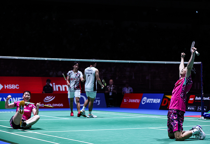 混合ダブルスの渡辺勇大&東野有紗ペアは、昨年の決勝で敗れたデチャポル・プアヴァラヌクロー&サプシリー・タエラッタナチャイペア(タイ)と対戦。「歴史をつくるぞ」(渡辺)という気概で臨み、逆転で優勝を決めると、東野選手はコートに背中から倒れこんで喜びを噛みしめました。