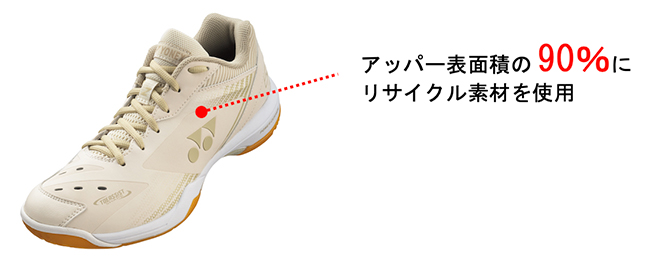 2001年の発売以来トッププレーヤーから一般プレーヤーまで幅広いプレーヤーに親しまれてきたバドミントンシューズ「パワークッション65」。本シリーズはリサイクル素材を使用したモデルで、この度パフォーマンスを維持しながらリサイクル素材使用率をアッパー表面積の90%まで上げた「パワークッション65Z C-90」を2023年9月中旬より数量限定で発売します。