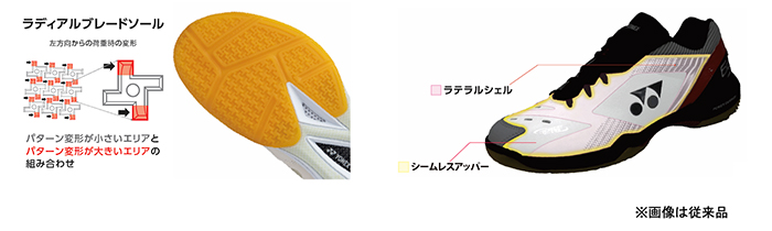 コートに吸い付くようなグリップ性を発揮する「ラディアルブレードソール」や推進力を向上させる「フェザーバウンスフォーム」、フィット感とホールド性を両立する「ラテラルシェル」などのテクノロジーにより、素足感覚の俊敏なフットワークをサポートします。