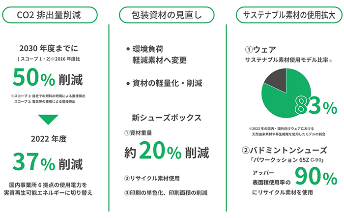 ヨネックスは、環境、ダイバーシティ、サプライチェーンの3つの分野でサステナビリティへの取り組みを行っており、環境においては、CO2排出量の削減、包装資材の見直し、シューズやウェアなどの製品へのサステナブル素材使用の拡大を進めております。