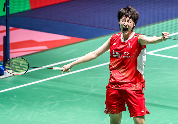 チェン・ユーフェイは、決勝戦、2ゲーム目を22―20で奪い、雄叫びをあげる