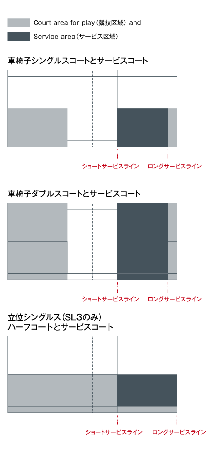 大きく分けて、車椅子と立位のカテゴリーがあり、それぞれの障がいに合わせてクラス分けがされています。競技規則としてはバドミントンとほぼ共通ですが、独自の競技規則もあります。例えば、下記のようにそれぞれのカテゴリーでコートの設定が異なります。