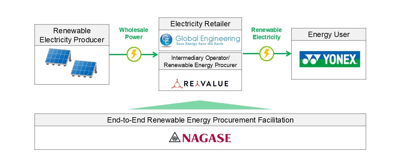 Yonex will receive renewable electricity from GLOBAL ENGINEERING Co., Ltd., an electricity retailer, and Reivalue, Inc., an intermediary operator, with Nagase & Co., Ltd. coordinating the overall initiative.