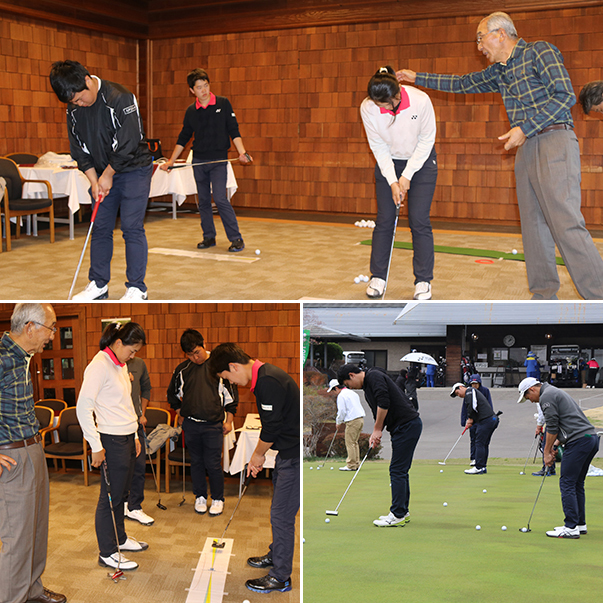 また、試合終了後に「1mのパットが90%以上の確率で入る」のキャッチコピーで多くのプロの使用実績を誇るトライプリンシプルパターを始めトライプリンシプル理論を発案した清永明氏(福岡大学名誉教授)によるパター講習会を開催。室内では「物理の法則」を、グリーン上では練習法やグリーンの傾斜の読み方等の実技に分けて行いましたが、講習を受けた選手達からは「信じられない」「腕がスムーズに動いて振りやすい」等驚きの声が上がりました。講習会は表彰式後も延長して行われ、皆最後まで熱心に聞きいっていました。