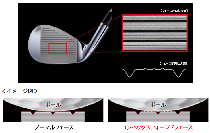 弊社の新潟工場が誇る超精密鍛造技術により、フェース表面の溝と溝の間の平面上に25μ(0.025mm)以下の微細な凸ラインを設けることで、凸ラインがボール表面に食いつき、スピン性能が向上。