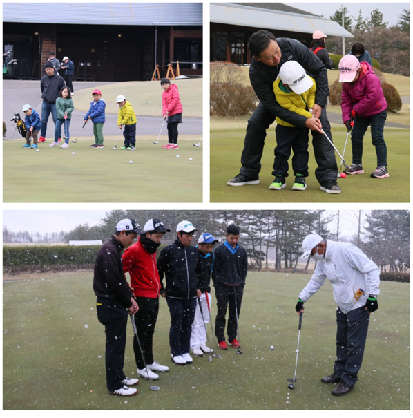 また、特別講師に「1mのパットが90%以上の確率で入る」のキャッチコピーで多くのプロの使用実績を誇るトライプリンシプルパターを始めトライプリンシプル理論を発案した清永明氏(福岡大学名誉教授)によるパター講習会を開催。グリーン上でパッティングの練習法やグリーンの傾斜の読み方等の実技を行いましたが、講習を受けた選手達からは「スライス、フックラインの狙い方がわかった」「腕がスムーズに動いて振りやすい」等驚きの声が上がりました。また、ゴルフ未体験のキッズ講習会も行われ、皆最後までゴルフを楽しんでくれました。