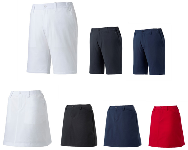 機能面ではハーフパンツ、スカート共に軽量で高いストレッチ性と制電機能を兼ね備えた機能を合わせ持ち、さらにハーフパンツは、脇ゴム仕様によりウエストサイズの許容を高め、快適なプレーをサポートします。