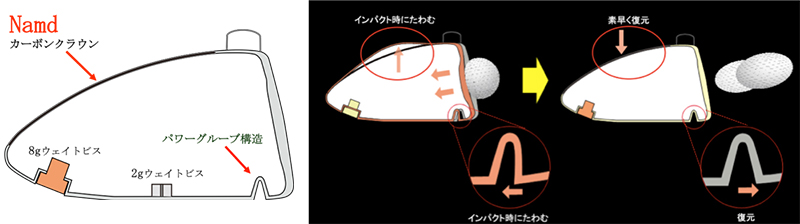 カーボンクラウンに新素材Namdを複合し、フェース上部領域の反発を向上させるとともに、ソールに採用した新構造のパワーグルーブ(溝)がフェース下部領域の反発を向上。クラウンとソールのダブルのたわみにより、オフセンターヒットにも強い全面反発フェースを実現しました。