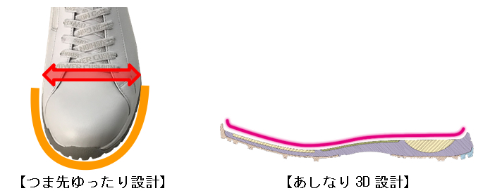 また、つま先をゆったりと設計し、幅広甲高の足でも履きやすくする一方、紐をしっかり締めることで細い足幅にも対応し、さまざまな足の形状に快適にフィット。さらに足の立体的な形状に合わせた「あしなり3D設計」を採用し、足裏全体で身体を支え、スウィングのブレを軽減させます。