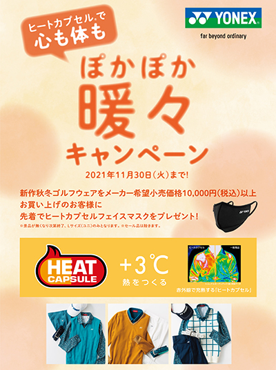 キャンペーン参加店において、新作秋冬ゴルフウェアをメーカー希望小売価格10,000円(税込)以上お買い上げのお客様に先着で、店頭にてヒートカプセルフェイスマスクをプレゼントいたします。