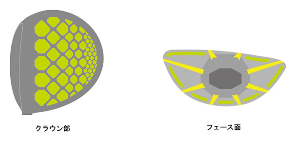 クラウン部またはフェース面に八角形の薄肉部を設け、低重心化・高反発化を図る構造を採用し、少ない力でも高弾道を生み出します。
